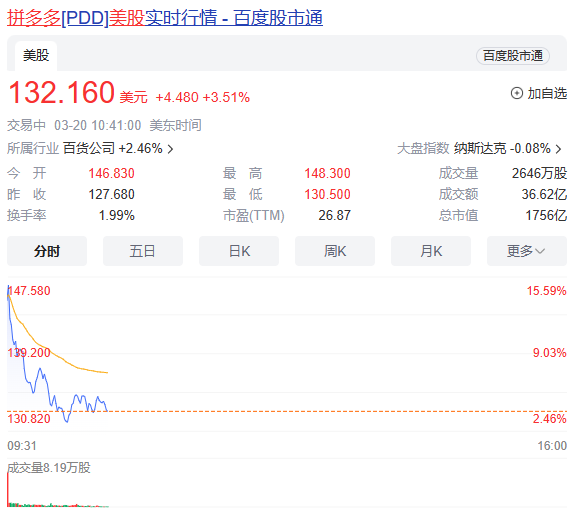 由于业绩表现远超市场预期,当晚,拼多多美股开盘涨超15%,市值一度接近1940亿美元,再度超过阿里巴巴。不过,随后股价涨幅收窄。