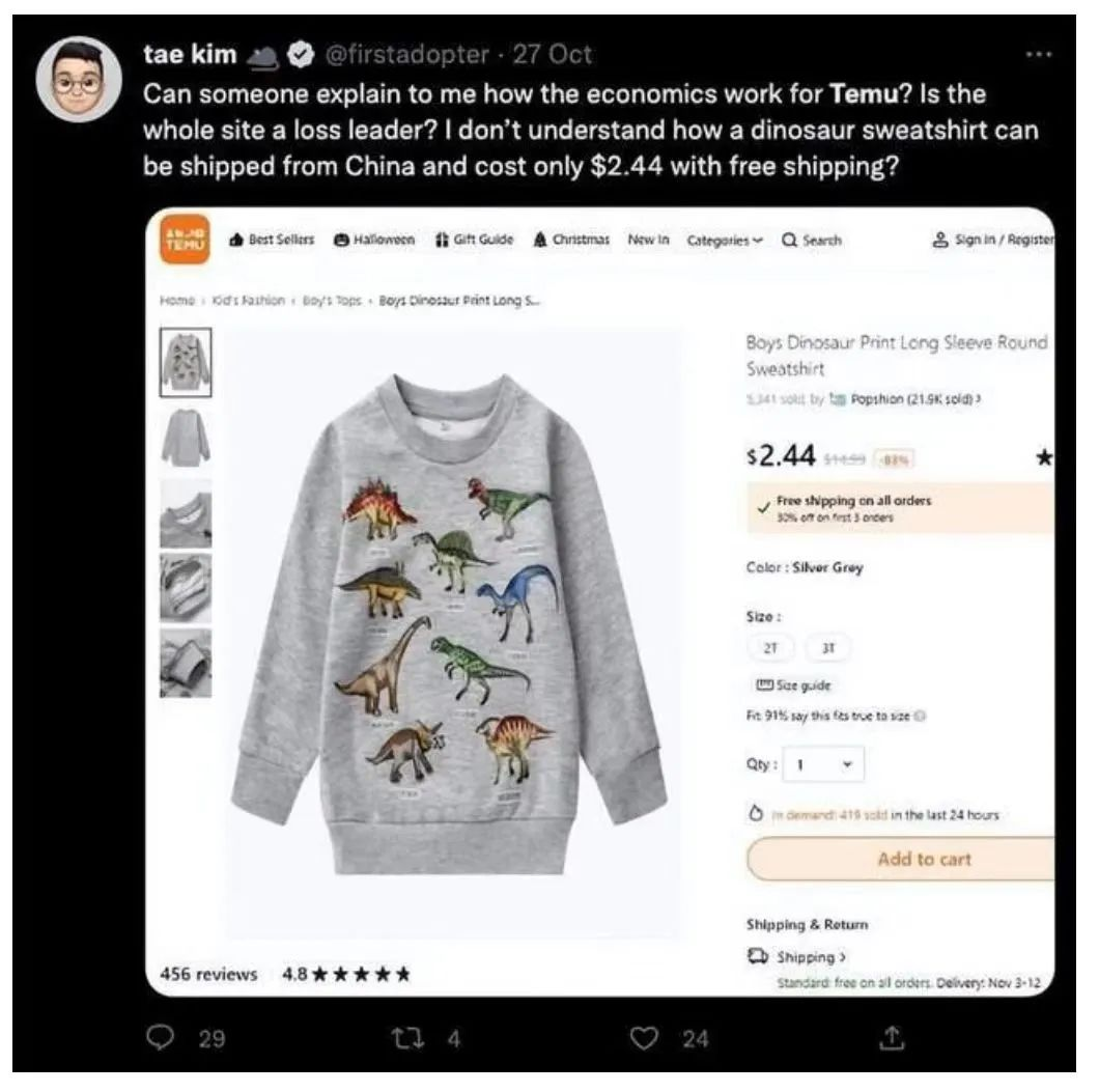 上面这位顾客的话的意思是:“谁能告诉我Temu运作的经济原理是什么吗?我实在无法理解他们是怎么做到的,一件恐龙T恤从中国发过来,价格只要2.44美金。”