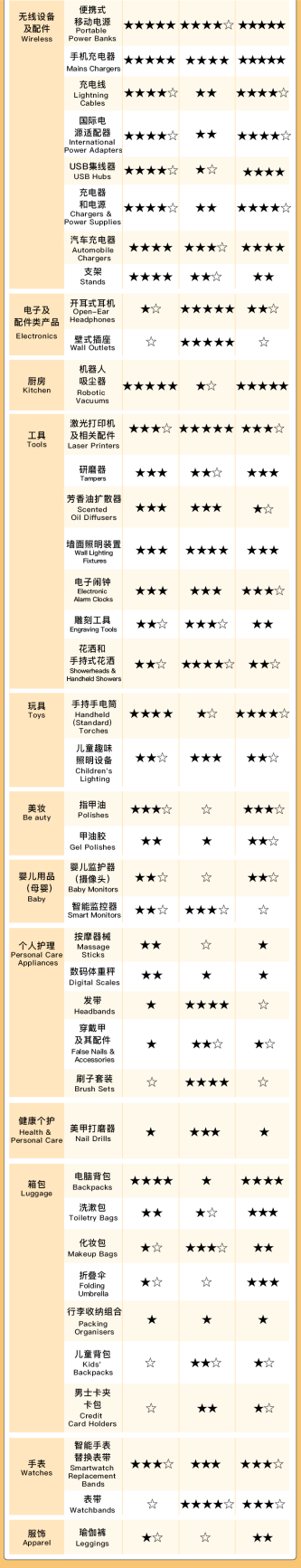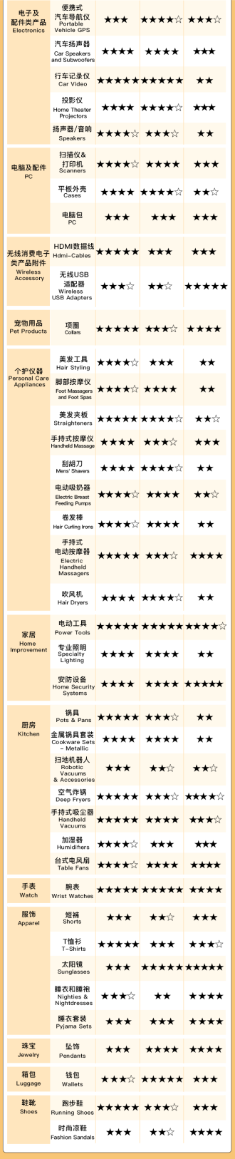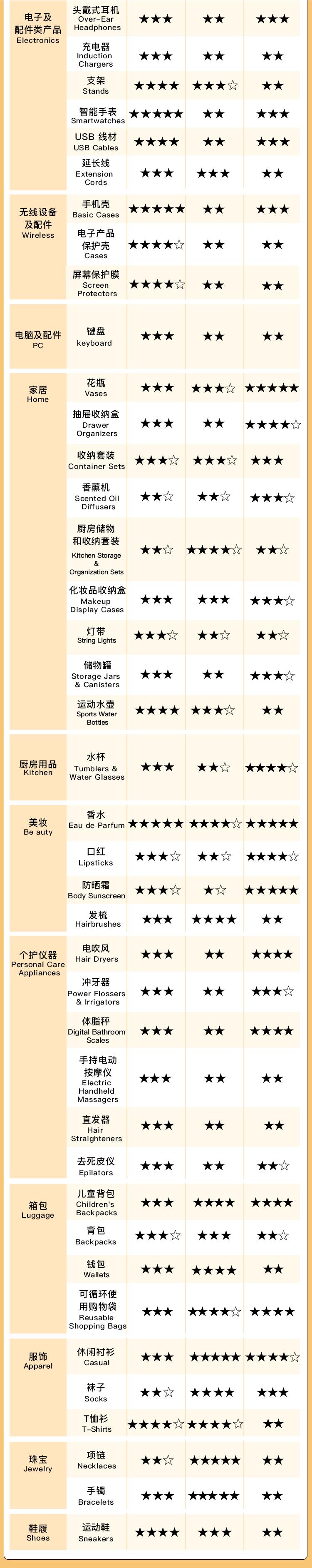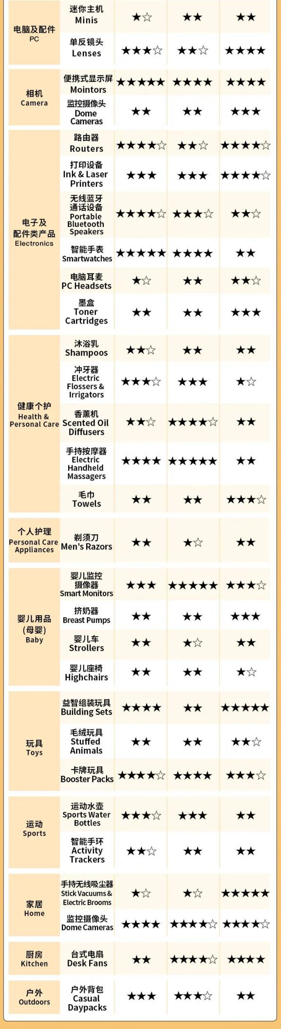 以中国卖家的渗透率为主要参考,体现中国卖家在此品类的成熟度和潜力。星级越高机会越大!
