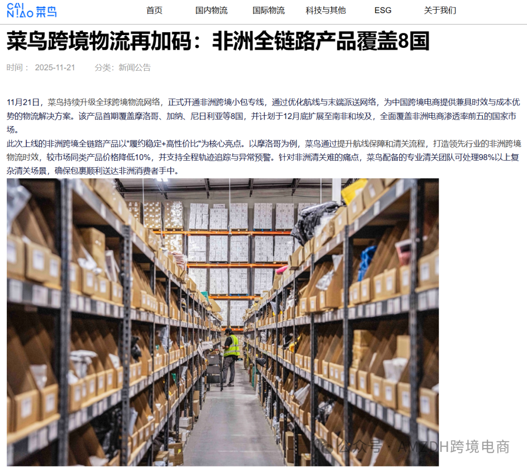 非洲电商市场正迎来爆发式增长,而菜鸟的跨境物流网络升级,为中国卖家打开了通往这片蓝海的“高速通道”! 近日,菜鸟正式开通非洲跨境小包专线,首期覆盖摩洛哥、加纳、尼日利亚等8国,并计划12月底前扩展至南非和埃及,全面覆盖非洲电商渗透率前五的国家市场。这一举措不仅优化了航线与末端派送网络,更以“时效+成本”双优势,为中国跨境电商提供了一站式物流解决方案。