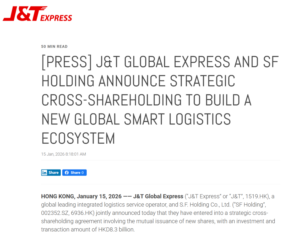 AMZDH获悉,2026年跨境电商圈第一记重磅合作落地!1月15日,顺丰控股与极兔速递联合官宣达成战略性相互持股协议,以83亿港元的资本纽带,正式开启全球物流资源整合新篇章。对正在布局海外的跨境卖家而言,这场 "强强联手" 不仅重塑行业格局,更直接带来了覆盖全球的物流解决方案升级 —— 从跨境头程到末端派送的全链路优化,终于有了更可靠的选择。