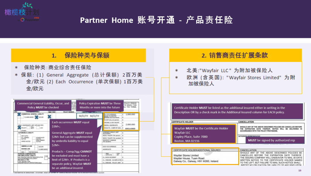产品责任险:需购买产品责任险,保额总计200万美元/欧元/英镑,每次事故赔偿限额100万美元/欧元/英镑。
