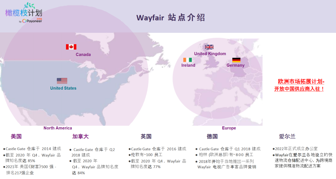 ● Wayfair在2014年成功上市,市场包括美国、加拿大、英国、德国、奥地利、爱尔兰等多个国家,业务覆盖北美和欧洲多个市场。