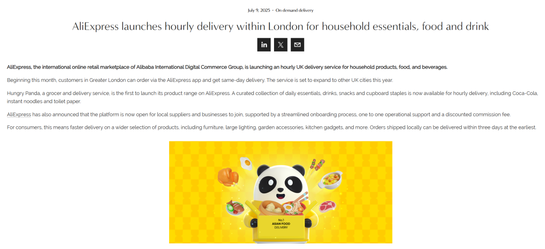 7月10日,速卖通在英国大伦敦地区推出“Hourly Delivery”服务,用户可通过平台首页直接下单零食、饮料、日用品等商品,由英国本土外卖公司Hungry Panda负责配送,实现“即点即达”。这一服务具有以下特点: