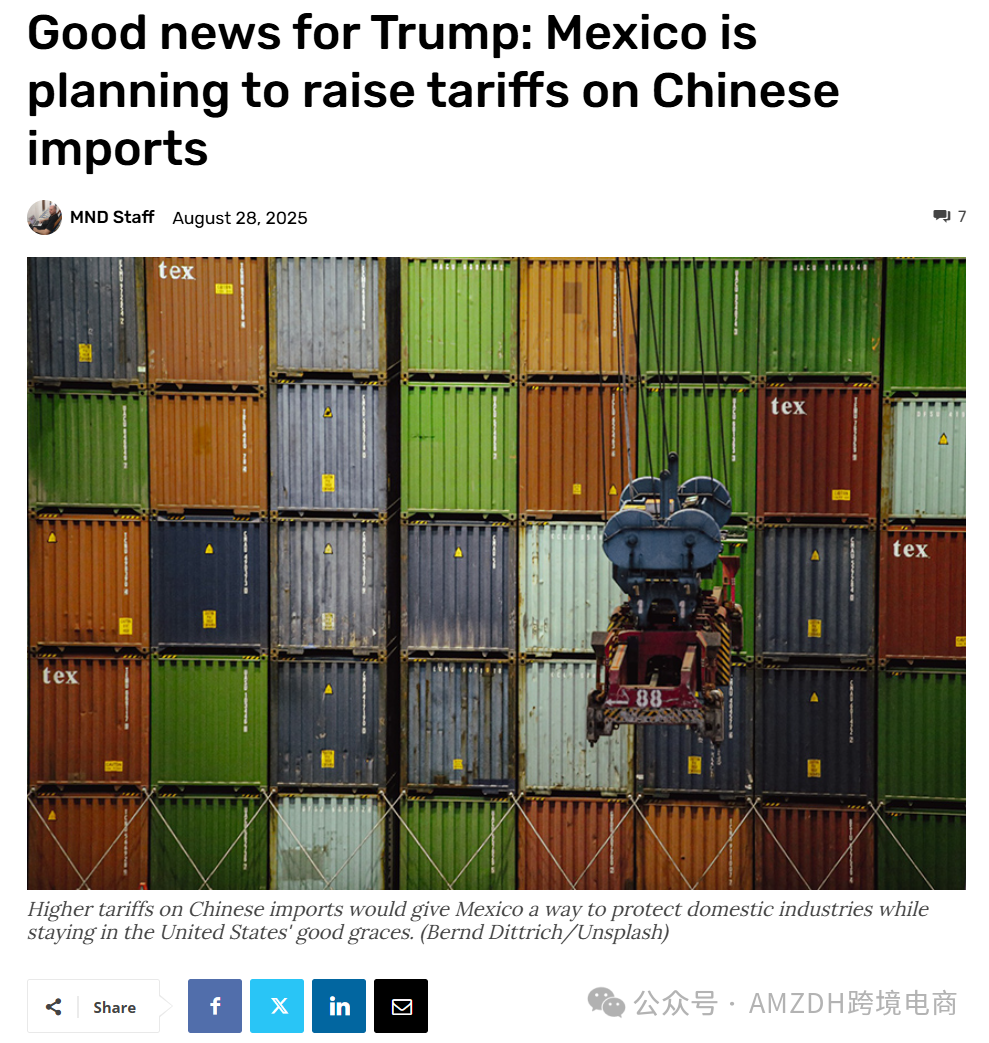 AMZDH获悉,据墨西哥日版报道,墨西哥政府计划在9月8日前提交的2026年预算案中,增加对中国进口商品的关税,涉及的产品包括汽车、纺织品及塑料等,旨在保护本土企业免受低价进口商品的冲击。这一举动也被视为对美国总统特朗普长期要求的回应。具体的关税水平尚未确定,计划可能会调整,其他亚洲国家也可能面临关税上调。这是谢因鲍姆政府上任后首次提出针对中国商品的加税方案。