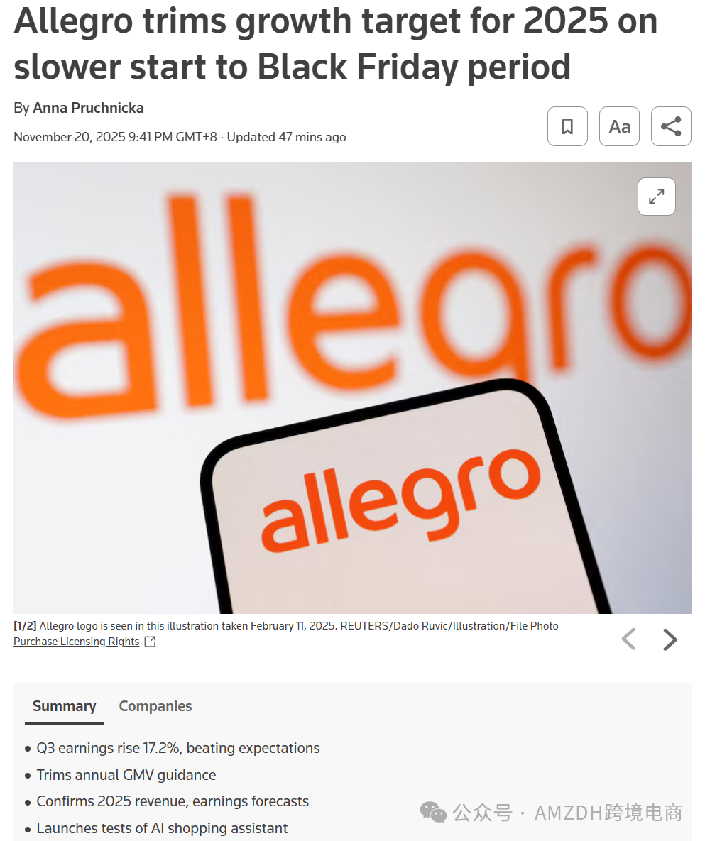 AMZDH获悉,近日,波兰最大电商平台Allegro公布了其第三季度财报,核心收益数据超出市场预期,但受“黑色购物周”消费疲软影响,公司同步下调全年增长预期。这一财报既展现了Allegro在波兰市场的韧性,也暴露出欧洲消费环境变化对电商行业的冲击。本文将从财报亮点、增长压力、行业趋势三个维度展开分析,并探讨卖家如何应对市场波动。