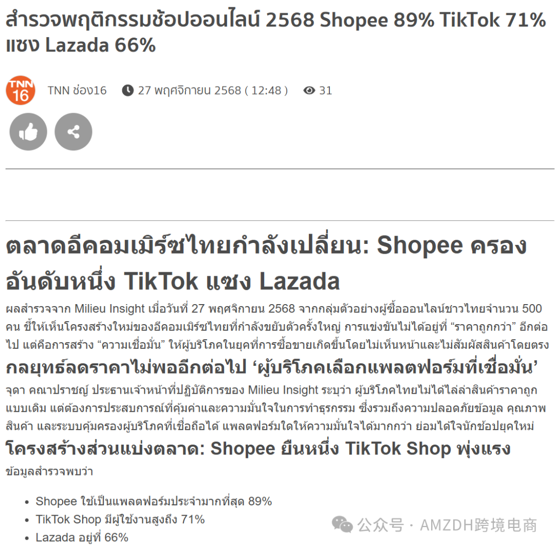 AMZDH获悉,作为东南亚第二大电商市场,泰国正以蓬勃的增长态势吸引全球跨境电商从业者的目光。最新数据显示,泰国电商市场规模已达 1.07 万亿泰铢(约 329.56 亿美元),年增长率 17.6%,而当地研究机构 Milieu Insight 的调查更勾勒出当前市场的竞争全貌 ——Shopee、TikTok Shop、Lazada 形成 “三强争霸” 格局,消费者行为也从 “唯低价论” 转向 “综合价值考量”,为入局者提供了清晰的战略方向。