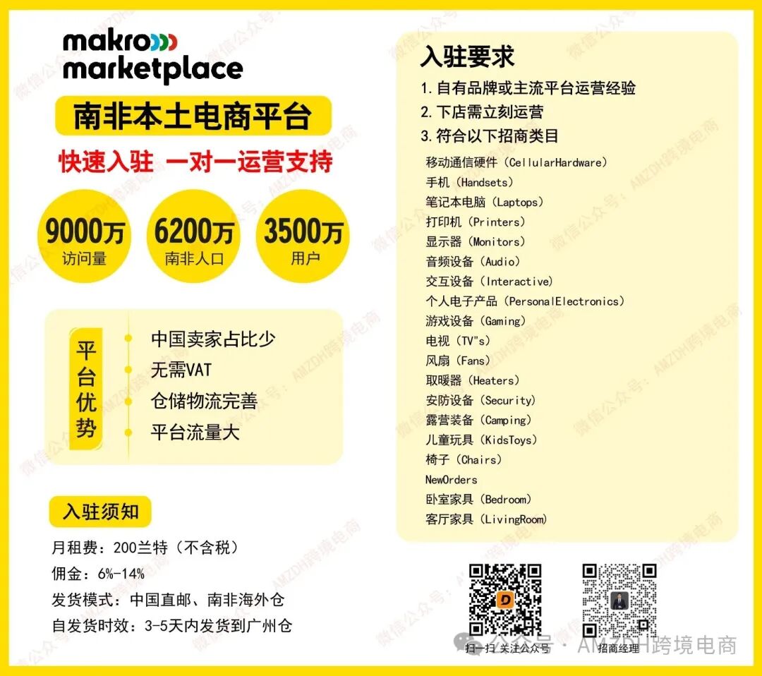 Makro是非洲知名的连锁零售品牌旗下电商平台,支持中国商家自发货,同时兼容B2C和小额B2B订单。平台主打 “品质零售 + 批量采购”,自发货商品可同时对接个人消费者和本地小批发商,适合家居建材、家电、办公用品等品类。其优势在于依托线下零售网络的品牌信任度,自发货商家的商品更容易获得消费者认可,市场竞争相对缓和。