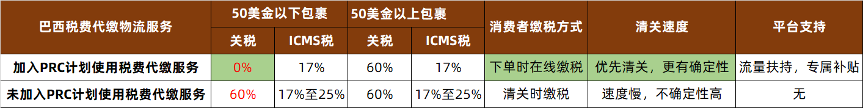 Remessa Conforme是巴西政府为限制跨境商品倾销、保护本土公司出台的系列税务规定,今年8月1日正式生效。主要内容包括,对于加入该计划的平台,低于50美元的跨境包裹可以免征关税,但需要缴纳17%的商品服务流通税(ICMS);而高于50美元的包裹,需要缴纳60%的关税,叠加17%的ICMS税。