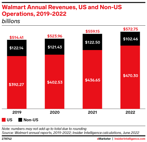 根据数据显示,沃尔玛 2022 财年收入较上年增长 2.4%,达到 5727.5 亿美元。