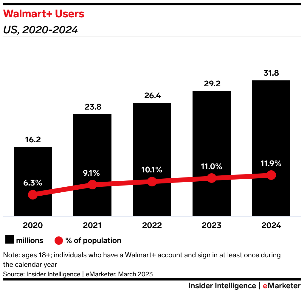 据eMarketer的预测,今年的沃尔玛会员将会增加11%,具体会员人数将突破2900万人以及超1500万家庭。