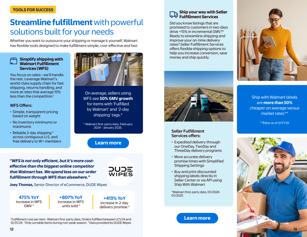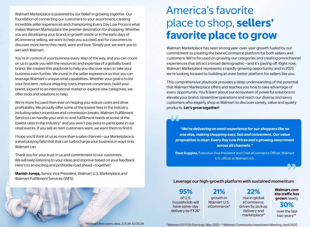 AMZDH获悉:沃尔玛近日发布《2025 Marketplace卖家运营手册》,全面概述了其在履约服务、国际拓展、广告解决方案和卖家支持计划方面的最新战略。这份手册由沃尔玛美国Marketplace与沃尔玛履约服务高级副总裁Manish Joneja及电子商务执行副总裁Dave Guggina主导,针对2025财年的整体发展方向提供了详细指引,并涵盖从毕业季到年末促销季的高峰期运营建议。沃尔玛电商平台的流量在过去两年增长近30%,美国电商业务增长21%,全球电商增长22%。平台预计到2026财年将覆盖95%的美国家庭实现当日达服务。