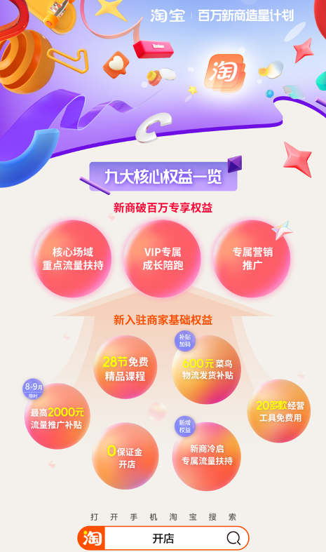 日前,淘宝“百万新商造星计划”9大权益再次升级,持续释放面向中小商家的扶持政策,为新商新品开辟冷启动专属流量池,提供600元菜鸟物流发货补贴,还有百万新商专属成长扶持、商家层级权益中心全新上线等新动作。此外,新商在淘宝开店的过程也将被进一步简化。据了解,目前商家上淘宝App搜“开店”即可一键开店。