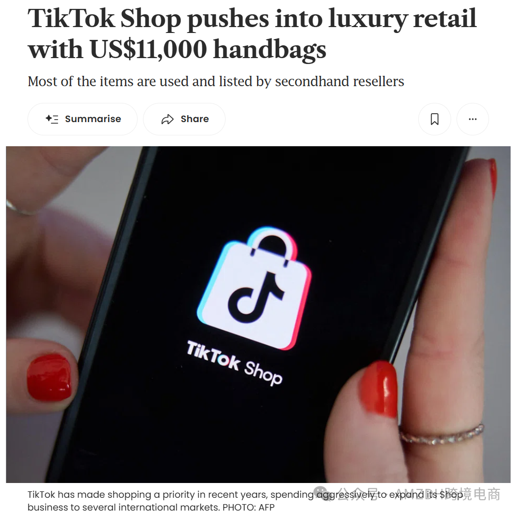 AMZDH获悉,2025年11月26日,TikTok Shop正式进军美国奢侈品零售市场,上线售价1.1万美元的高端手包,成为平台首个奢侈品品类。黑五期间,平台GMV同比激增200%,突破1亿美元,涵盖爱马仕、香奈儿、LV联名鞋及劳力士手表等高价单品,最高单价达11000美元,标志着TikTok从“低价爆款”向“高端消费”战略转型。