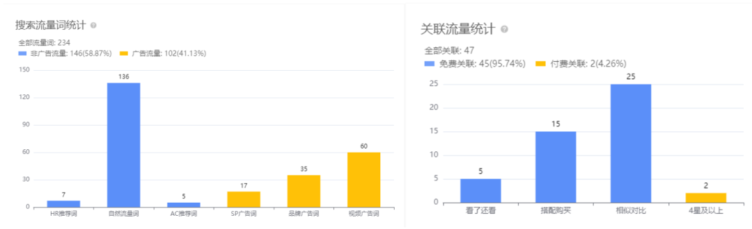 AMZ123获悉,店铺的流量来源方面,主要集中在自然搜索+亚马逊对比推荐+站外推广;其中自然搜索流量词占比高达52%,而其余的则是视频广告和品牌广告占据多数;关联流量主要是靠亚马逊自动推荐对比,近1天里获得了47个曝光;而站外方面卖家有超50+的推广记录。