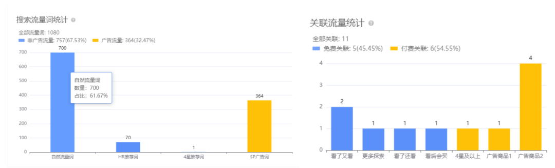 AMZ123获悉,店铺的流量来源方面,主要集中在自然搜索+SP广告;自然搜索方面,卖家在近1个月有1080个词进入了搜索前3页,其中自然搜索流量词占比高达61%,站外方面没有推广记录。