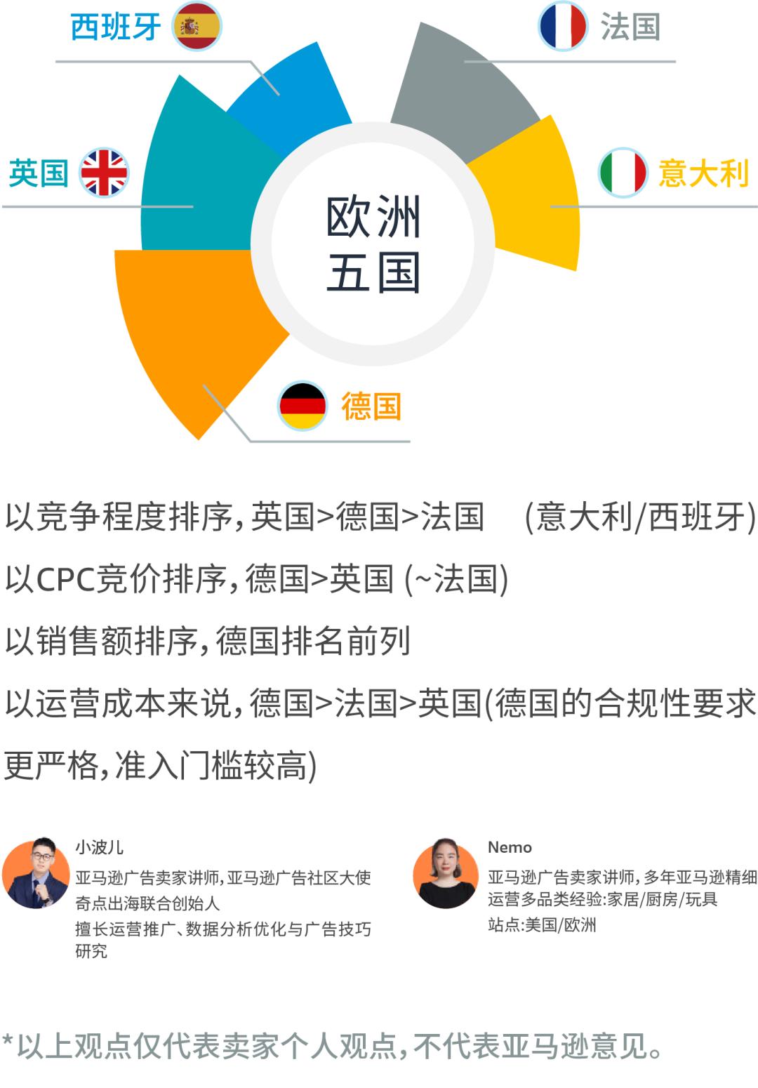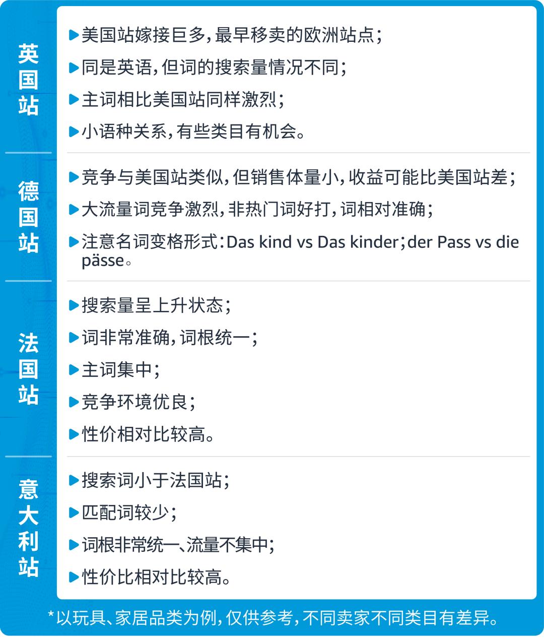 由于欧洲各站点间的体量及竞争环境存在差异,可以将欧洲站点划分为英德、法意西、新兴站点三个量级,建议卖家朋友们需根据各站点的流量特性制定对应的投放策略。