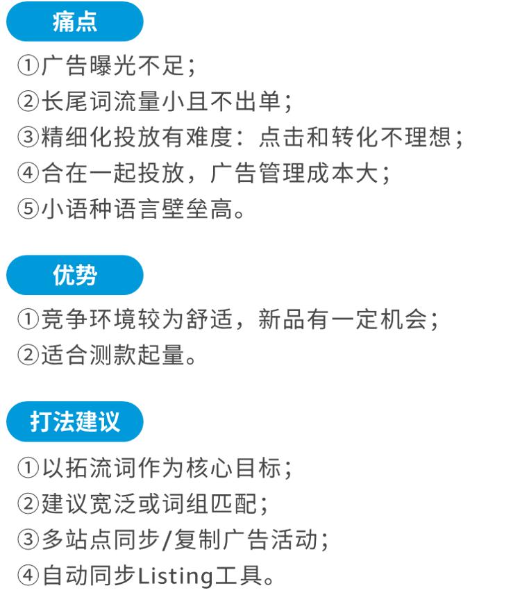 针对欧洲各国站点的差异性和共性,以下是欧洲站不同站点间的关键词广告打法,来帮助卖家广告投放得到有效曝光,从而提升店铺流量。