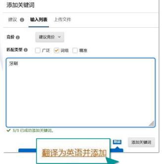 使用首选语言输入关键词,仅需三步,即可通过翻译功能“添加以目地站点默认语言显示”的匹配关键词到广告活动中。