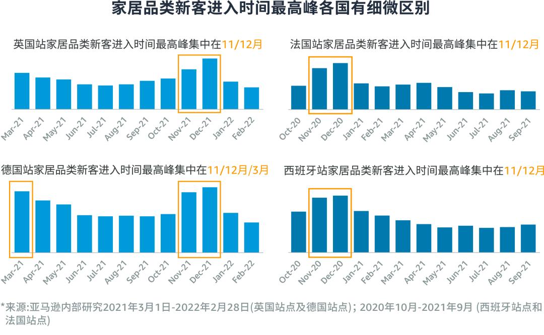 家居品类新客进入时间的最高峰多为11月、12月。另外,3月份还是德国站的高峰期。卖家可提前备货。