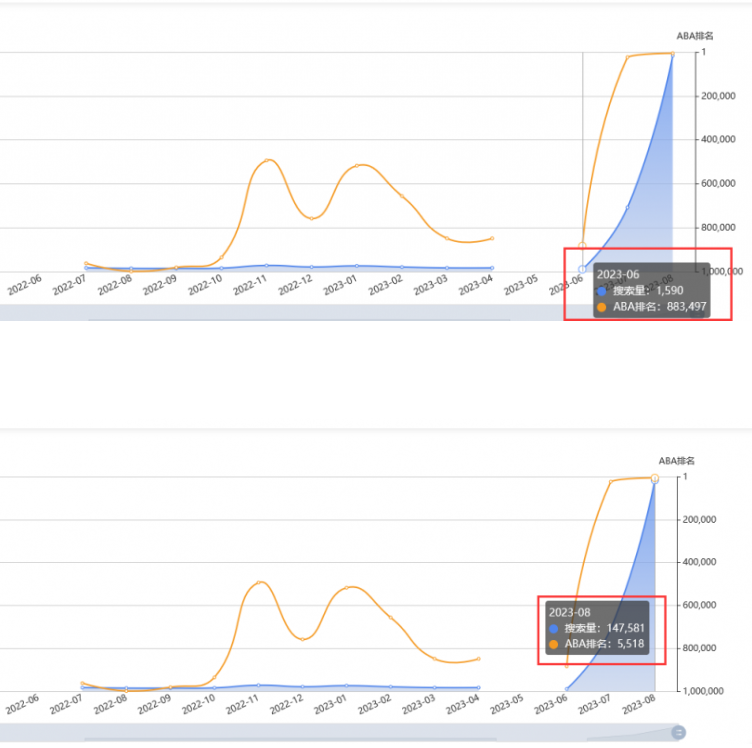 一位卖家发现,在短短一个多月里,亚马逊美国站上有一款产品的主要关键词搜索量从1590直接猛增到将近15万,搜索量排名从88万名开外猛升到了5500多名。