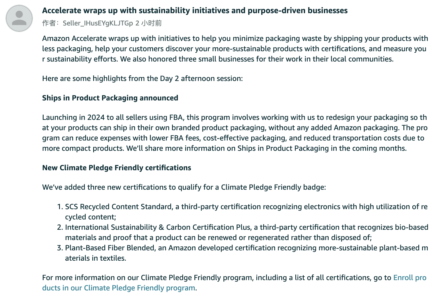 亚马逊美国站发布公告称Amazon Accelerate大会推出多项举措,计划于2024年向所有FBA的卖家取消亚马逊包装来减少包装浪费;亚马逊还添加了三项新认证,以便卖家获得气候承诺友好徽章;即将推出可持续发展解决方案中心,以下是公告内容: