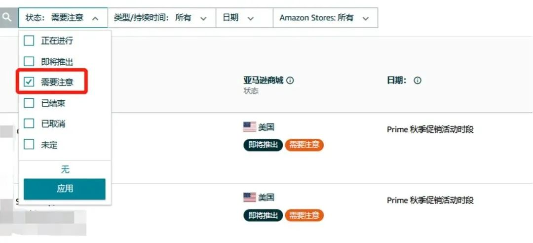 卖家平台 -> 广告 -> 秒杀 -> 筛选出状态为“需要注意”的Deal活动