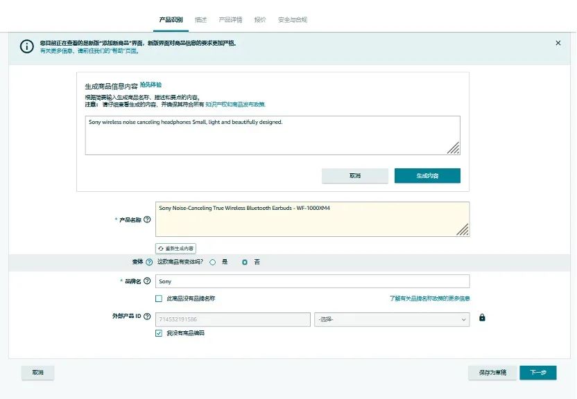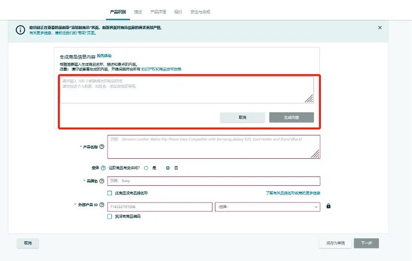 特别注意:「生成商品内容(抢先体验)」只是一个强有力的助手,卖家还需仔细审查生成的内容,确保其准确性并符合所有知识产权和Listing政策。因为AI生成的商品内容可能包括未包含在您原始输入中的信息和描述。