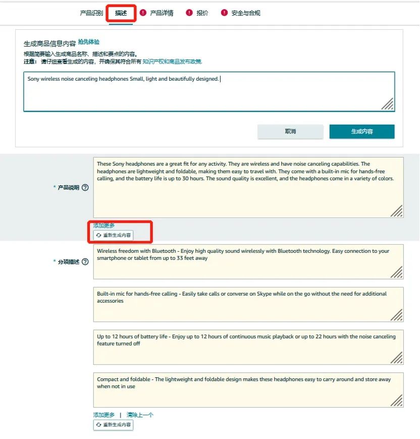 在输入框中填写产品描述,点击“生成内容”。AI会自动生成内容填入“产品说明”和”5点描述”框内。卖家可以继续修改,或点击“重新生成内容”,让AI提供更多的选项。
