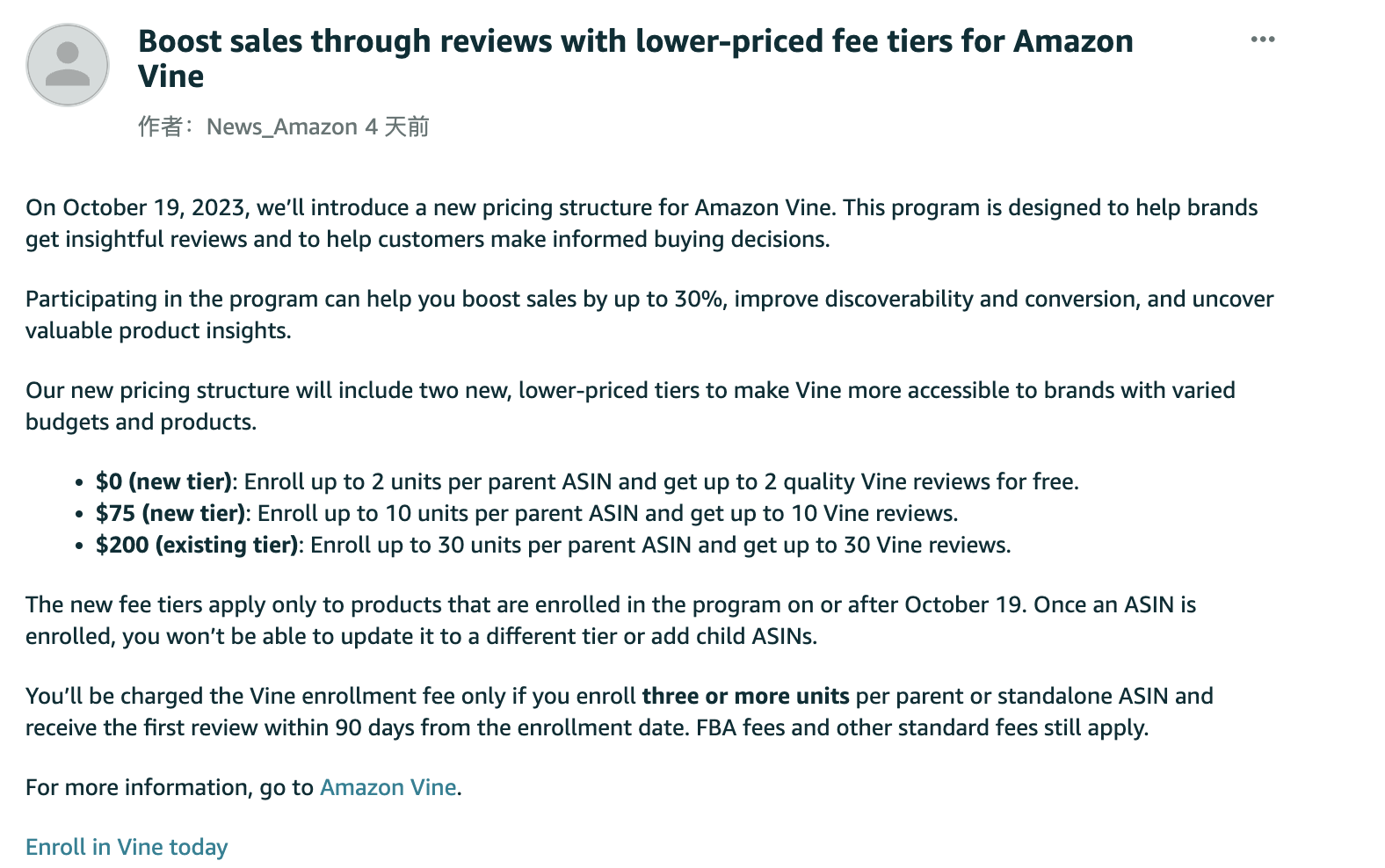 亚马逊公告指出,参与AmazonVine计划的商品最高可帮助销售额提高30%。2023年10月19日之后注册新费用层级的商品,将无法更新到不同的层级或添加子ASIN。
