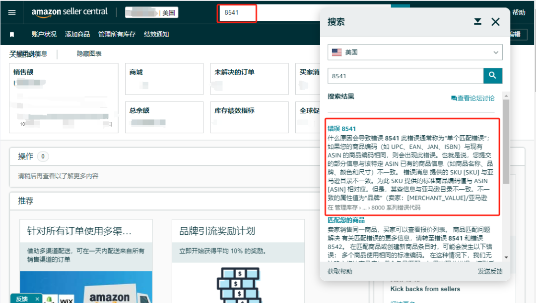 8541报错原因,亚马逊官方的解释:如果您的商品编码 (如 UPC、EAN、JAN、ISBN) 与现有ASIN 的商品编码相同,则会出现此错误。也就是说,您提交的部分信息与该特定 ASIN 已有的商品信息(如商品名称、品牌、颜色和尺寸)不一致。提供SKU与亚马逊目录不一致。