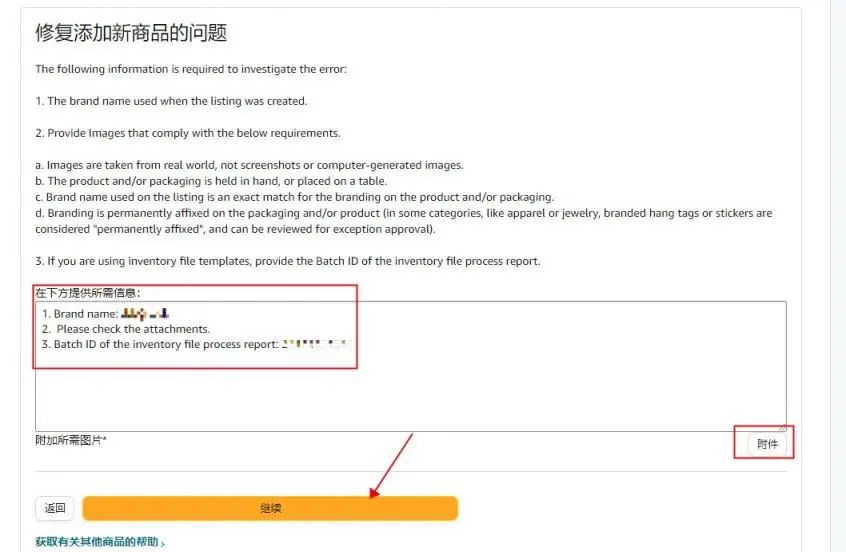 4、填写联系原因:申请白名单的品牌名称,带logo的相关包装图和产品图,还有表格上传报错的编码(模板上传的时候brand那里就填写你想做白名单的品牌)。