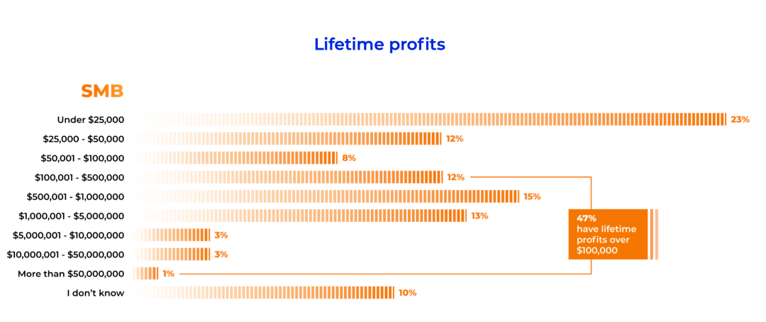 47% 的中小型企业卖家的终生利润已超过 100,000 美元;12% 的卖家终生利润在 100,000 美元到 500,000 美元之间。