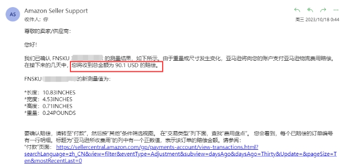 而且亚马逊还做了90.1 USD的赔偿,应该是这几天发货出去的FBA费用差价。
