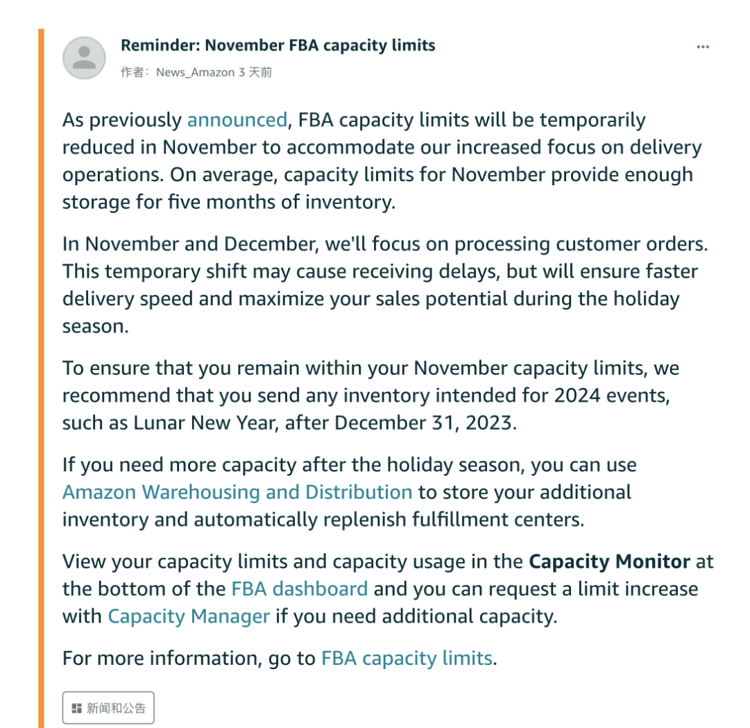 亚马逊欧洲站和美国站发布公告称,为配合其运营中心的工作调整,FBA容量限制将在11月份暂时降低。