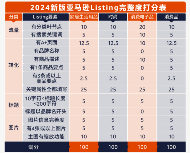 亚马逊公布了2024版的listing打分标准。新的打分表实施时间为2024年1月1日。以下为listing要素最新打分表,大家可以了解下:
