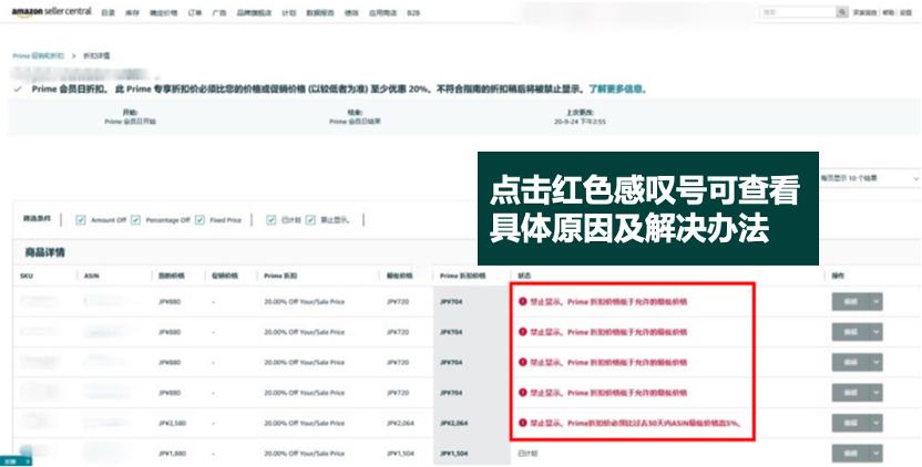 2.根据详情页面的指示修复促销价格、促销数量、或子变体覆盖率(错误将以红色字体或黄色标注)*