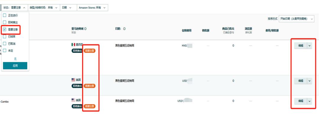 卖家平台 -> 促销 -> 筛选出状态为"需要注意"的Deal 活动