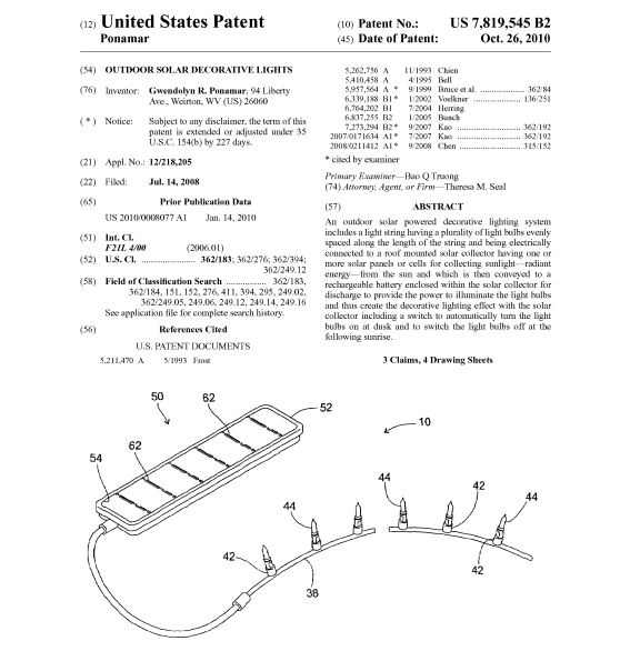 案件主要涉及以下美国发明专利,专利名称Outdoor solar decorative lights,专利号US7819545B2: