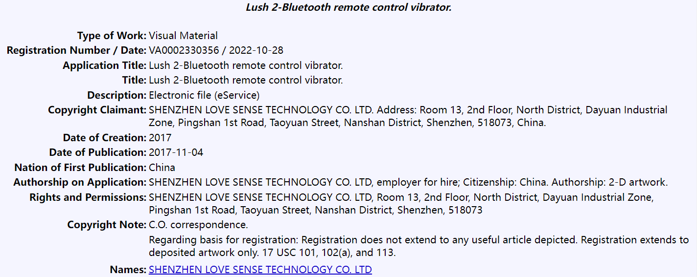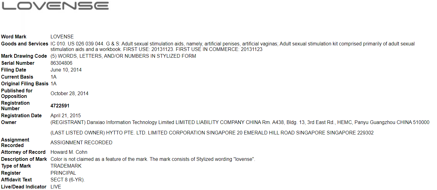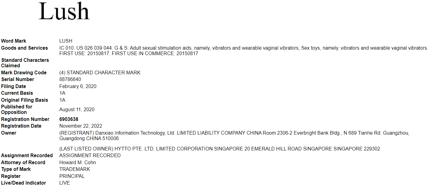 原告HYTTO PTE. LTD.是一家总部位于新加坡的成人玩具科技公司,主要业务是专门开发远程控制成人用品以及配套软件,此次主要为旗下品牌Lush发案维权。