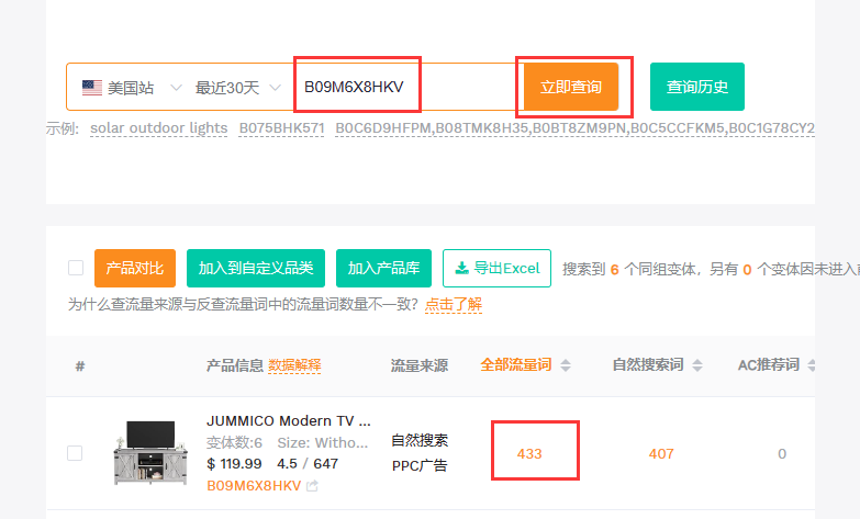 如果广告订单占比高,我们应该先看关键词来源占比。如果关键词广告流量来源高,那么基本订单占比也会高的了。我们可以借助卖家精灵来查看: