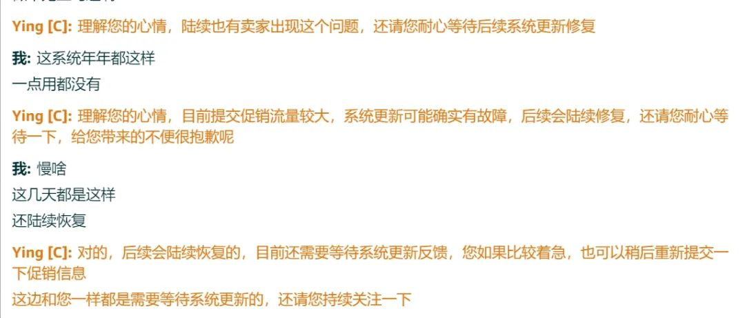 卖家还未等到爆单,未曾想亚马逊系统先卡爆了......而客服只是一味的解释需耐心等待系统更新。