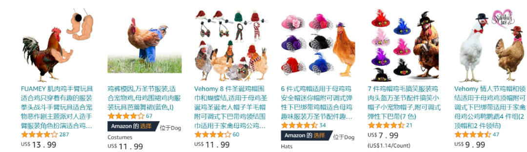 近日,不少卖家在选品时发现,与鸡相关的产品十分畅销。无论是宠物鸡的衣服、尿布、保护罩,或者是宠物鸡的头盔,甚至宠物鸡的鸡舍、鸡笼等相关产品都在各大平台受到海外消费者的欢迎。