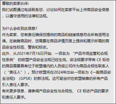 2023年,亚马逊也发邮件提醒卖家预计欧盟将在2024年将出台一项名为《一般商品安全法规》(GPSR)的新法规。现在,亚马逊对GPSR法规发布合规要求,欧盟销售的所有产品引入责任人的要求,即强制欧代合规。
