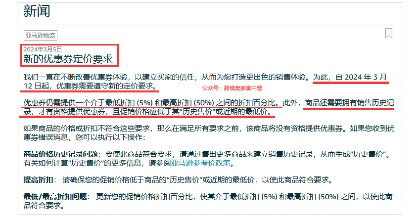 日前,美国站就发布了公告,将于3月12日实行美国站的coupons优惠券新规,优惠券将受到新的定价要求约束。