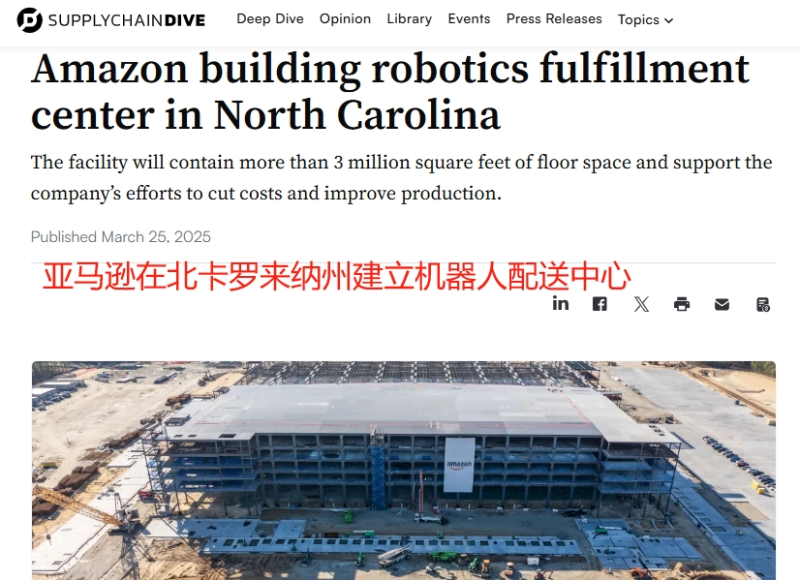 AMZDH获悉,近日,亚马逊宣布了一项重要物流基础设施建设项目——在美国北卡罗来纳州的威尔明顿建设一座全新的机器人履约物流配送中心,并计划于2026年正式投入运营。这一举措不仅体现了亚马逊在物流自动化领域的持续投入,也预示着电商物流行业将迎来更加高效、智能的新时代。